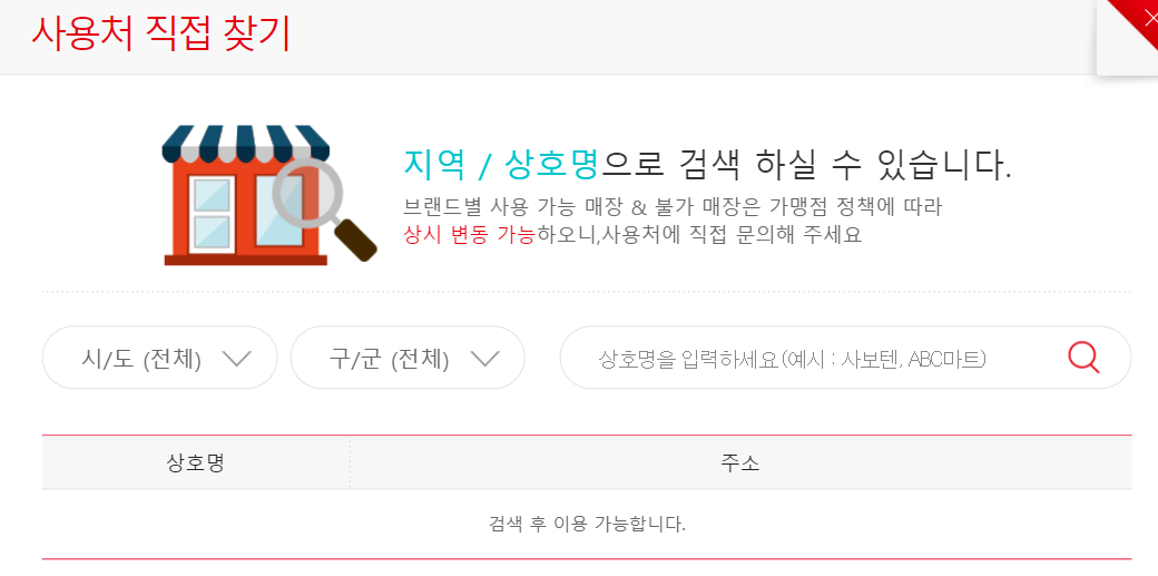 위에 소개드린 사용처 이외에도 내가 원하는 곳에서 사용할 수 있는지 알아볼 수 있습니다. 컬처랜드 홈페이지에 접속하여 상품권 - 사용처에 들어가면 사용가능한 곳 / 상품권 사용불가한 매장도 검색할 수 있습니다.