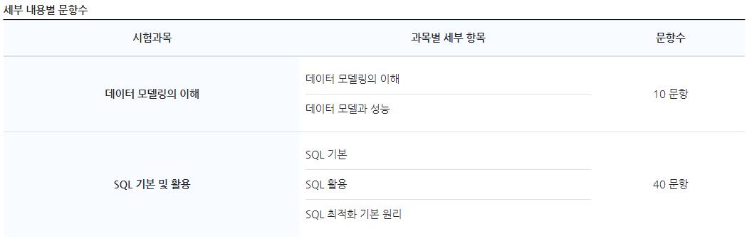 자격증시험은 필기시험으로 이루어져 있으며, 데이터모델의 이해 및 분석, SQL 이해 및 활용 두가지 과목을 공부해야 합니다. SQLD 자격시험의 과목은 총 2과목으로 구성되며 필기 50문항(50문항 중 단답형 10문항 이내 출제)으로 구성되어 있습니다. 시험 시간은 총 90분입니다.