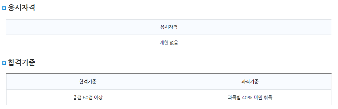 SQLD의 응시자격은 제한이 없습니다. 따라서 비전공자인 대학생이나 직장인분들도 도전할 수 있습니다. SQLD의 합격 기준은 과목 별 점수가 40% 미만 이면 과락으로 불합격됩니다. 따라서 과목 별 40% 이상, 총점 60점 이상을 취득해야 자격증 합격에 해당됩니다.