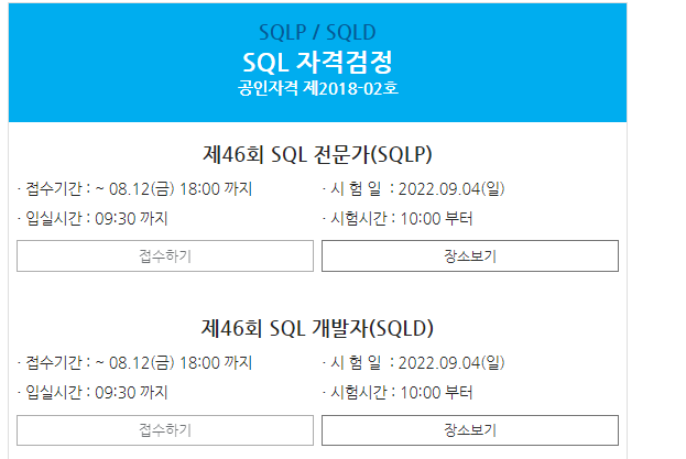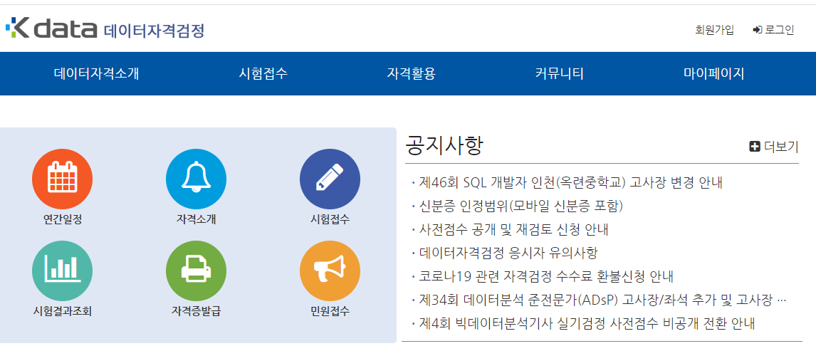 SQLD 시험접수 방법은 각 포털사이트에서 데이터자격검정 사이트를 통해 접속합니다. 사이트 회원가입을 한 뒤 접수기간에 맞춰 시헙접수를 진행하면 됩니다.